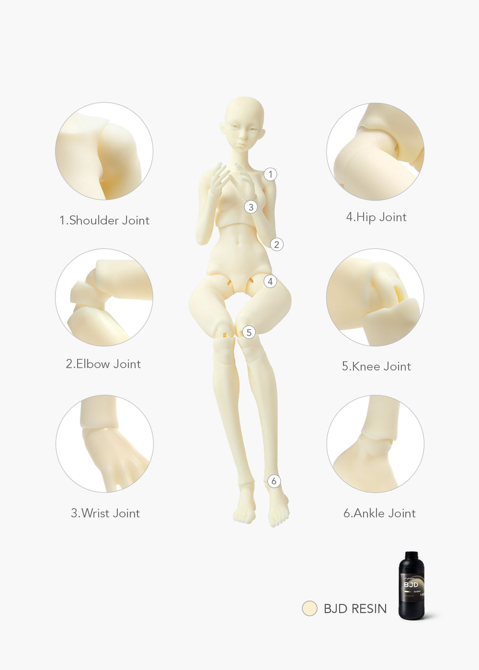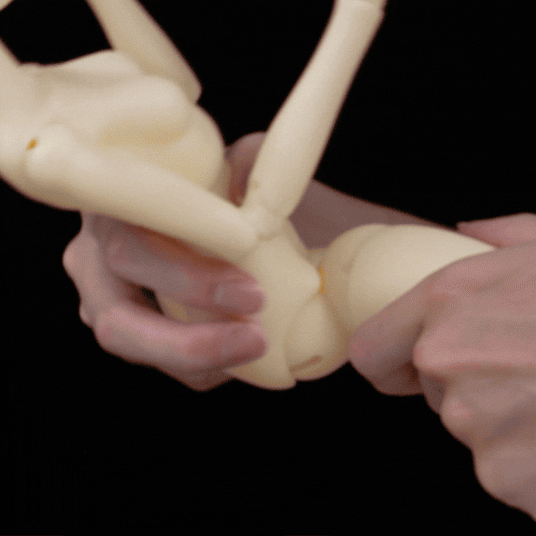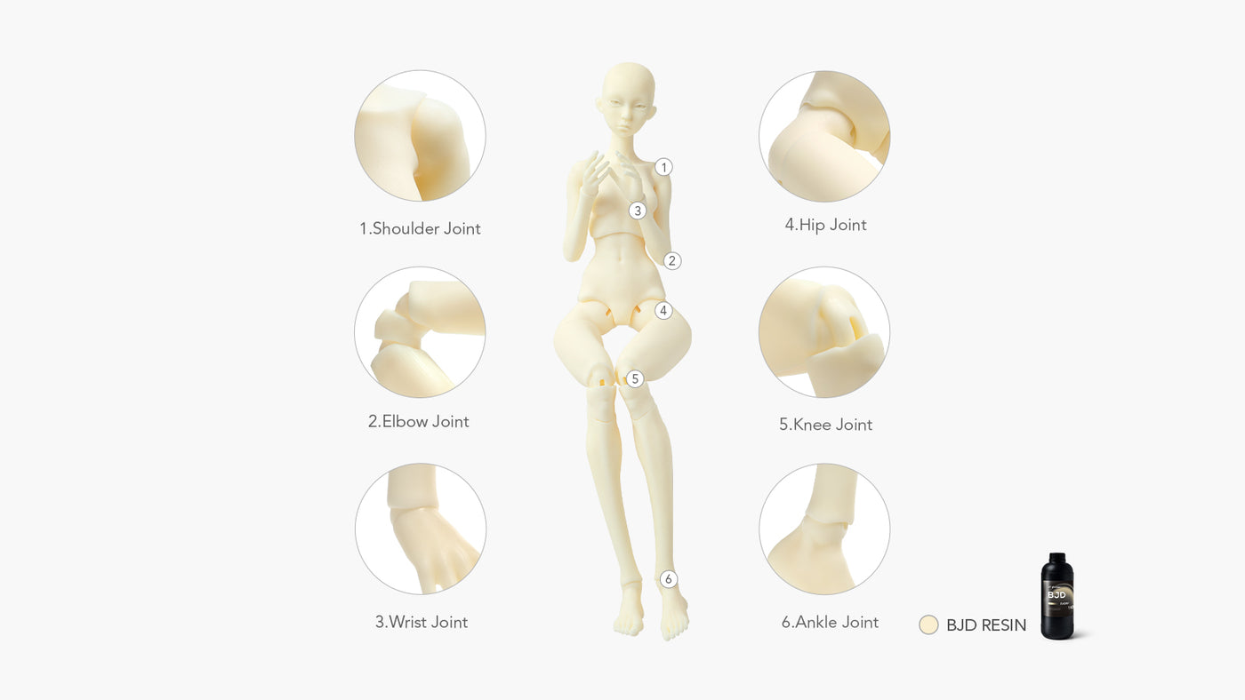 Phrozen BJD Resin supports a wide range of articulated joint structures, including shoulders, elbows, wrists, hips/legs, knees, and ankles.